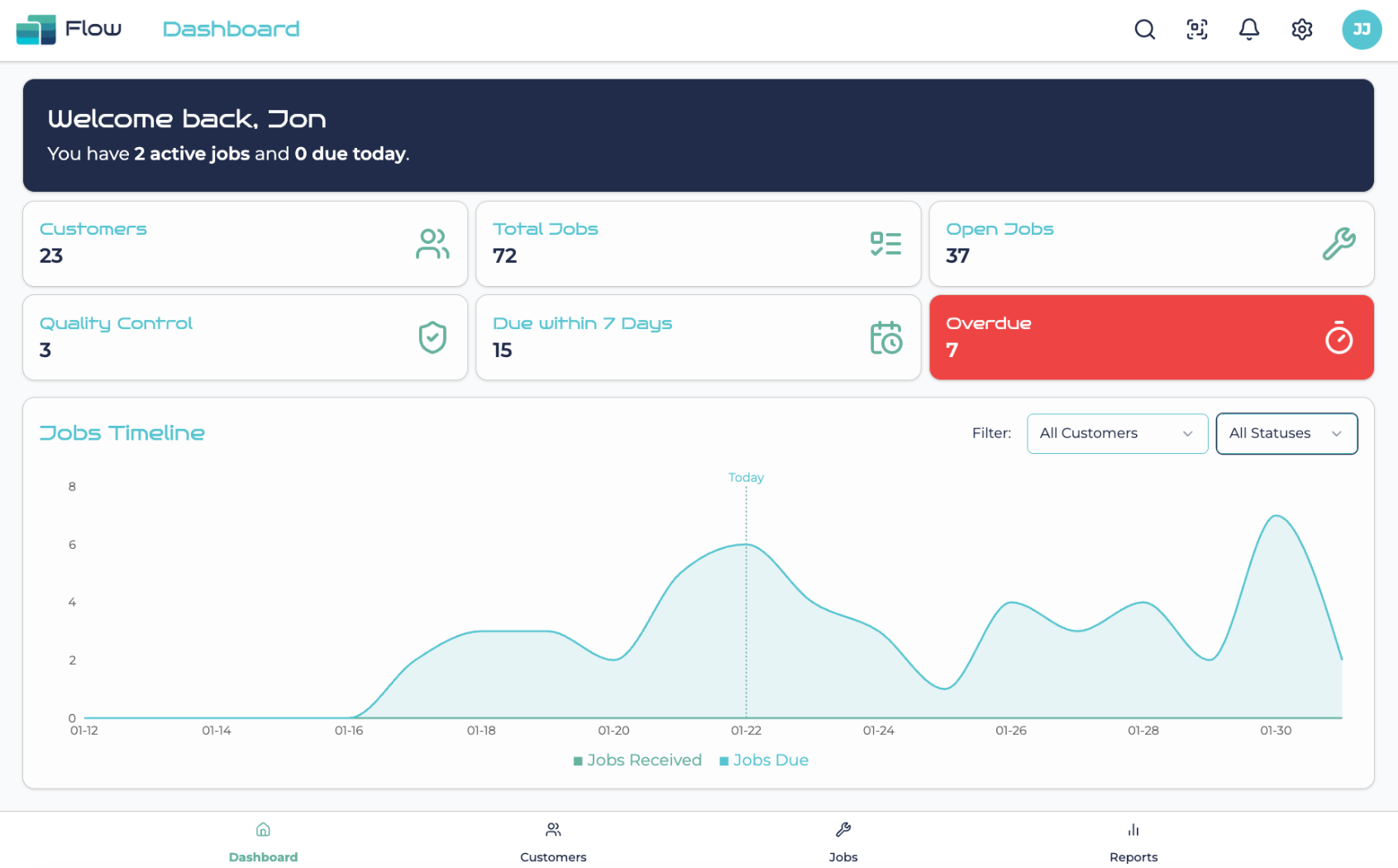 Flow shows the real state of work across bench and counter with workshop-ready statuses and clear ownership.