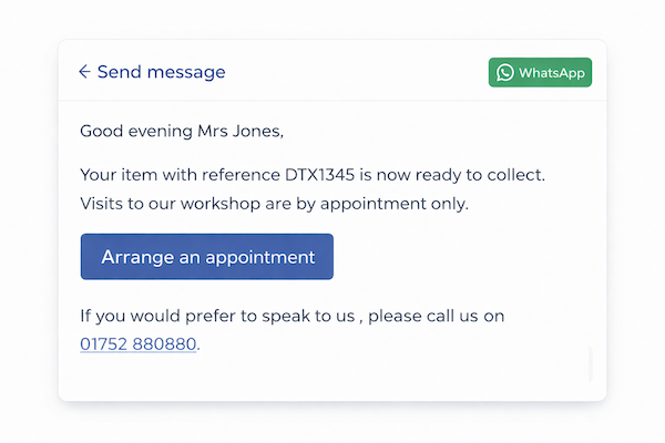 Jump to sectionAn appointment-only jeweller turned ‘ready for collection’ calls into one-click SMS/WhatsApp updates with a booking link.