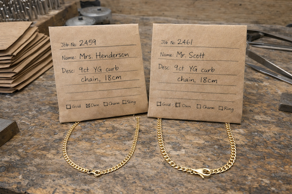Two packets reached finishing and quality control at roughly the same time. Both were described similarly ('9ct YG curb chain, 18cm'), and the chains were returned to the wrong packets. When the first customer arrived, they immediately said, 'that's not my chain.'